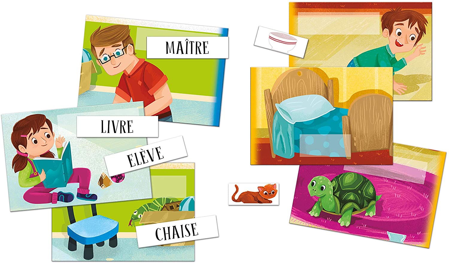 - 2 environnements très différents sont utilisés : l’école et la maison. Les enfants découvriront des mots simples de la vie de tous les jours en les associant aux images correspondantes.